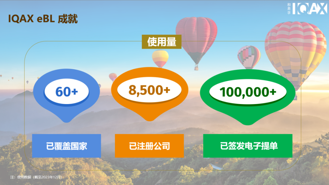 截止到2023年底,IQAX eBL在全球范围内的签发量已超过10万份,并帮助来自全球60多个不同国家的企业完成了提单的在线流转,线上实际注册企业达到8500家。