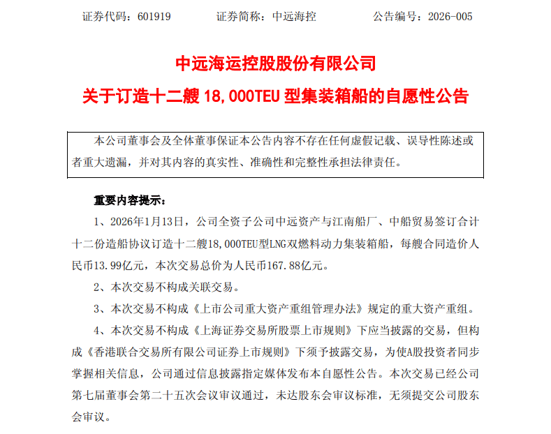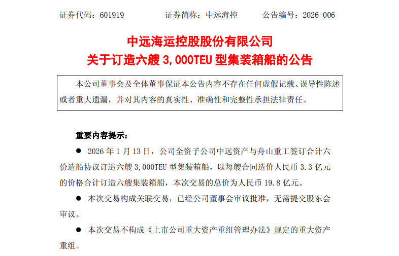 2026年1月13日,中远海控官宣2026年首笔重磅订单。