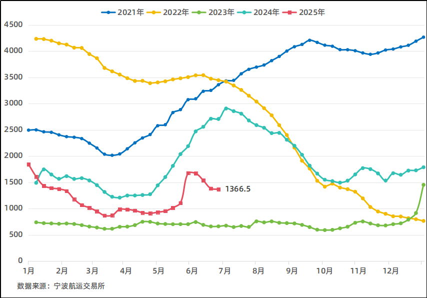 中东航线第一季度受目的地斋月(3月)影响,市场运价先跌后涨。3月中旬,目的地需求反弹,推动运价持续上涨,3月末运价环比上涨77%至1800美元/FEU,随后短暂回调。5月,美线舱位紧张引发连锁效应,船公司主动收缩运力导致中东航线舱位供给趋紧,市场运价上涨并维持在历史高位区间。6月伊以冲突升级后,船公司和货主均采取避险策略,供求关系维持动态平衡,截至6月末市场运价稳定在2500美元/FEU水平。