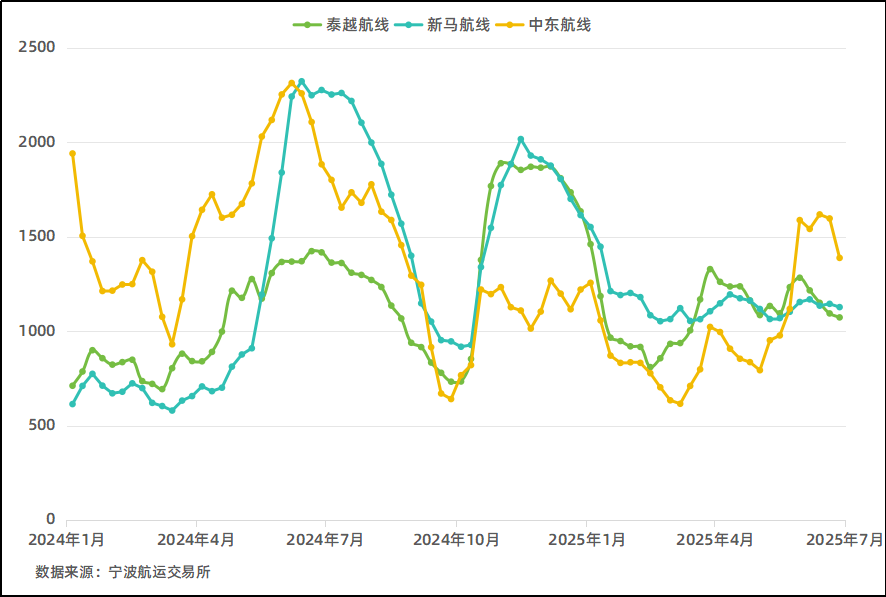 东南亚航线第一季度运价延续调整态势,呈现先跌后涨格局。4月,受美国对等关税政策升级影响,区域贸易结构加速重构,东盟中转国承接中国出口订单需求增加,推动泰越航线运价温和上涨至1040美元/FEU,新马航线上涨至850美元/FEU。截至6月末,运价基本稳定在涨后水平,泰越航线约920美元/FEU,新马航线约830美元/FEU,显示出转口贸易对运价的有力支撑。